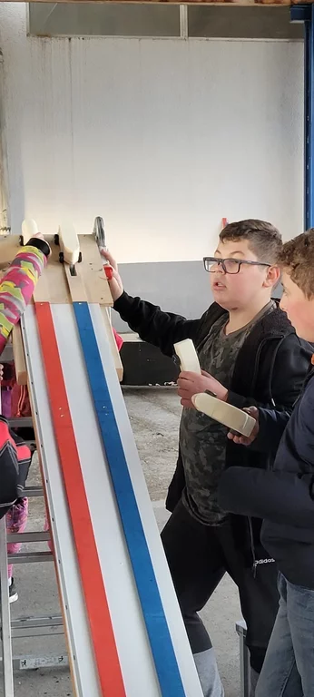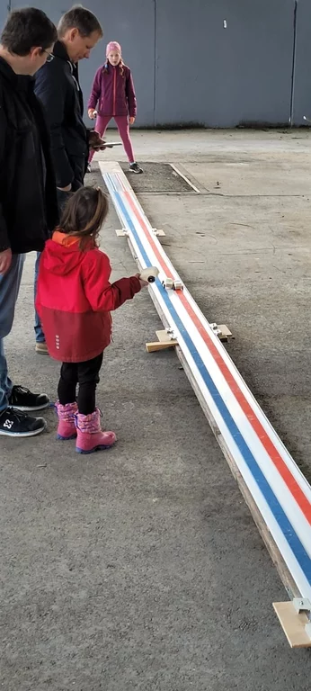 - Rennstrecke (Rollladenkastenprofil mit aufgeklebten Führungsleisten (Holz, farbig angemalt). Länge 3m.